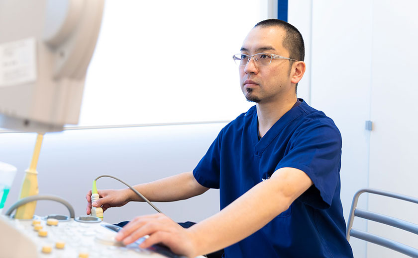 診察では、精巣・精巣上体などの外陰部診察を行い、次に直腸診で前立腺・精のうに異常があるか調べることもあります。